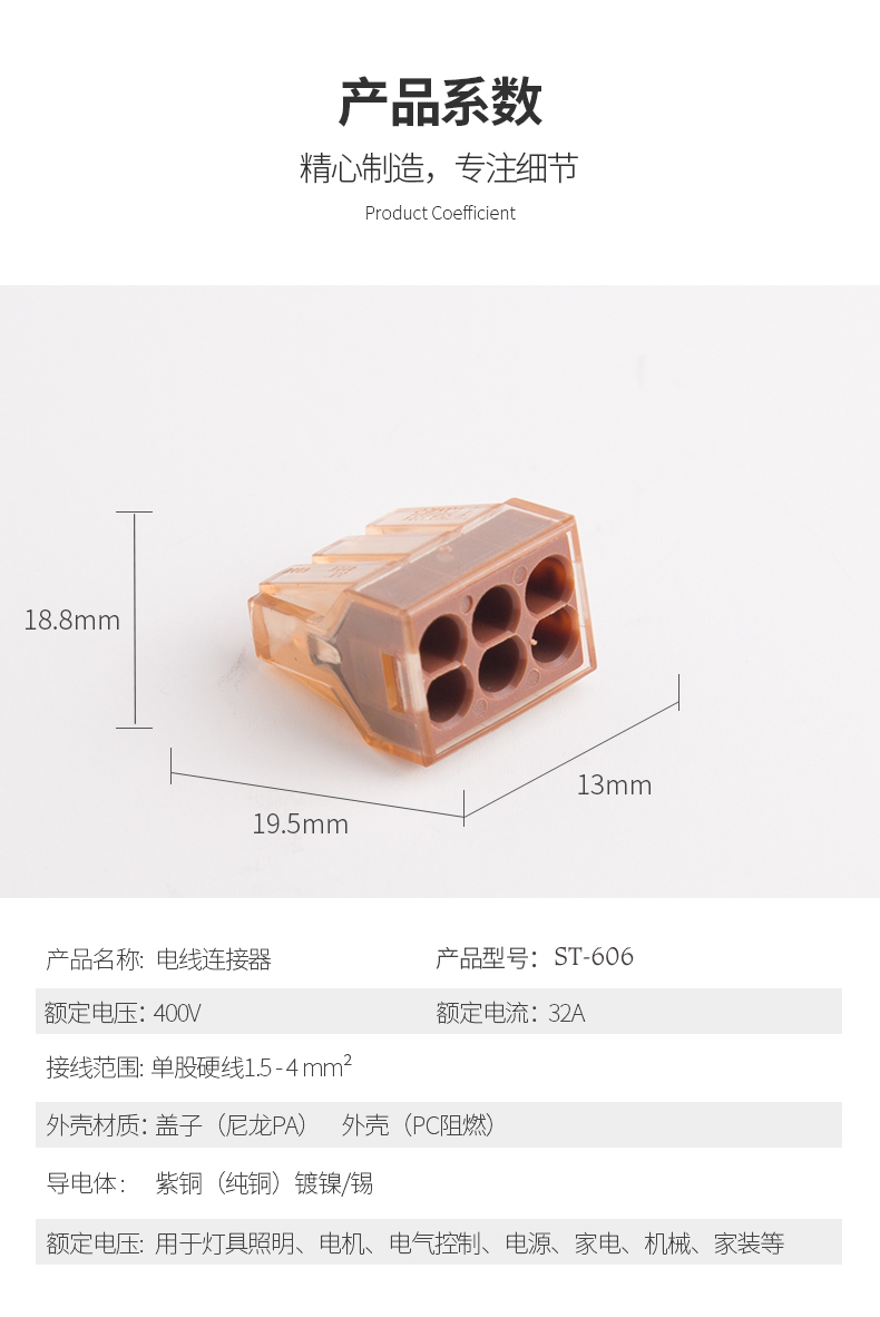 額定電流:400A額定電流:32A導(dǎo)線線徑:1.5-4mm²耐電壓:AC2500V/1Min機(jī)械性能環(huán)境溫度:-40°C~+105°C剝線長度:12mm尺寸:19.5*,9.2*,13.1材質(zhì)及電鍍塑件:PC,UL94V-2彈片:不銹鋼觸點(diǎn)材料:電解銅鍍鎳錫